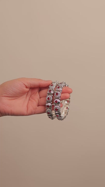 Oxidized Silver-Plated Bangles with Red Stone Embellishments