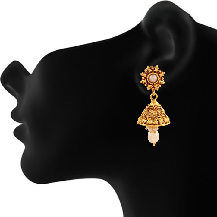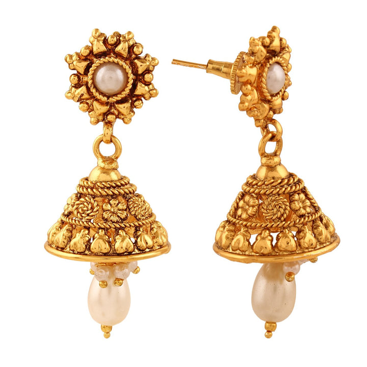 Sun‑kissed pearl studs lead to intricately carved dome jhumkis finished with a dainty rice‑pearl dangler—lightweight antique‑gold charm that elevates kurtas, sarees, and festive fits.