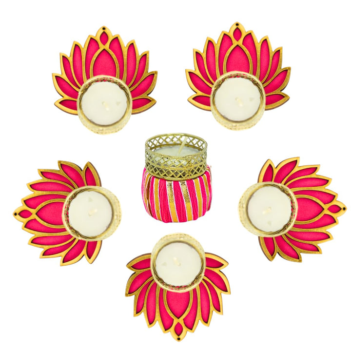 Set of 6 Tealight Holders | 5 Glow Lotus Candle Holders & 1 Pink Shine Glow Bangle Holder with Tea Light Candles for Diwali, Weddings & Pooja