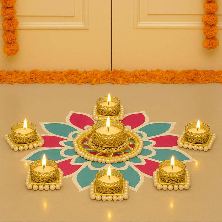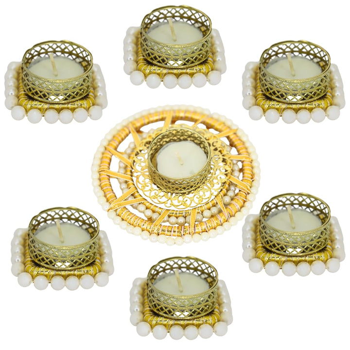 Set of 7 Tealight Holders | 6 Pearl Square Bangle Holders & 1 Sunshine Pearl Holder with Tea Light Candles for Diwali, Weddings & Home Décor