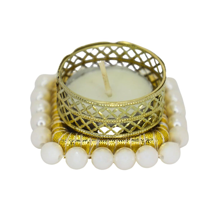 Celebrate your special occasions with this Set of 7 Decorative Tealight Holders, featuring 6 Pearl Square Bangle Holders and 1 Sunshine Pearl Holder with tea light candles. Each pearl square holder is crafted from premium golden metal latticework and adorned with white pearl beads, giving it a unique and elegant look. The Sunshine Pearl Holder serves as a beautiful centerpiece with intricate circular design and pearl accents, perfect for adding grandeur to your festive setup. Together, these tealight holders create a warm and glowing ambiance ideal for Diwali, Navratri, Karwa Chauth, weddings, Christmas, housewarmings, and pooja rituals. Lightweight, reusable, and durable, this set is easy to clean and perfect for rangoli decorations, pooja thalis, mandirs, dining tables, or entryways. A thoughtful and festive gift option for family and friends, this combo adds elegance, positivity, and tradition to any celebration.