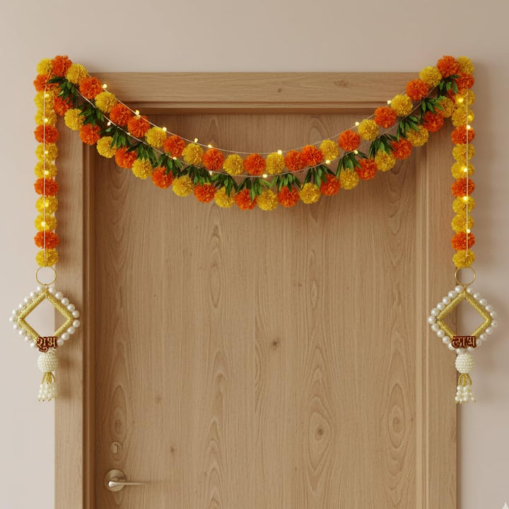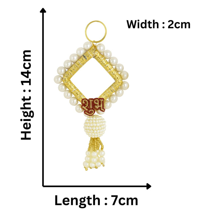 Give your home a festive and auspicious look with this Shubh Labh Square Toran, crafted with a golden frame bordered by pearls and finished with elegant pearl tassels. Featuring the sacred “Shubh” and “Labh” inscriptions, it symbolizes blessings, prosperity, and positivity. Its unique square shape adds a modern touch while retaining traditional charm, making it an ideal choice for decorating entrances, pooja rooms, mandirs, or living room walls. Perfect for Diwali, Navratri, Ganesh Chaturthi, weddings, and housewarming ceremonies, this toran is a versatile addition to your festive décor. Designed to be lightweight and durable, it is easy to hang and can be reused for multiple occasions. Its blend of pearls, golden accents, and auspicious motifs makes it not only a beautiful decorative piece but also a thoughtful gift for friends and family during festive seasons.