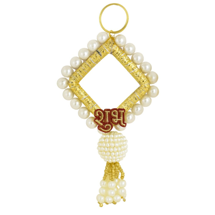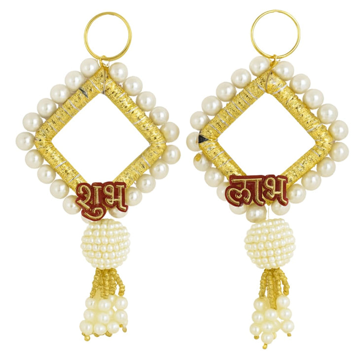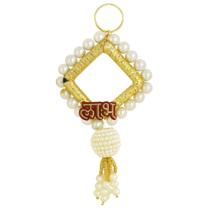 Shubh Labh Square Toran with Golden Frame & Pearl Border, Decorative Door Hanging with Tassels for Diwali, Pooja Room & Festive Wall Décor