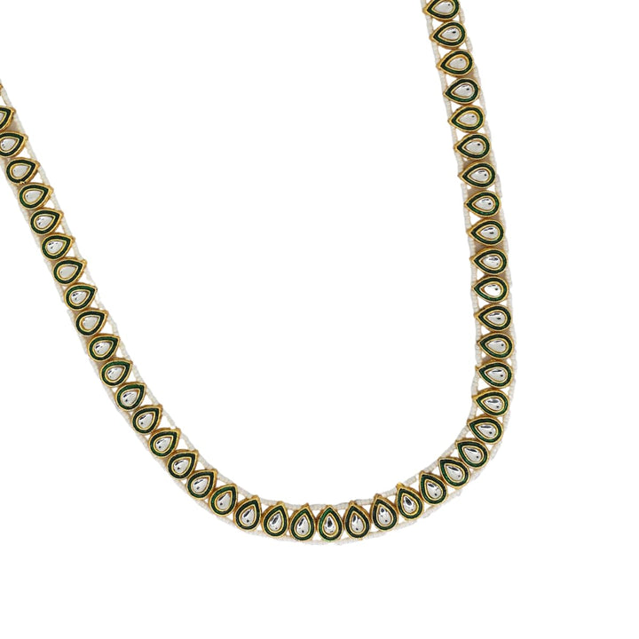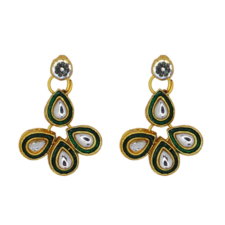 - Handcrafted design with teardrop Kundan stones, green enamel detailing, and gold-tone plating