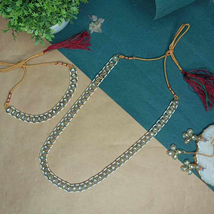 Bring timeless elegance to your ethnic look with this handcrafted Boond Shape Kundan Necklace Set, designed for weddings, festivals, and special occasions. The set includes a long necklace, a choker-style short necklace, matching earrings, and a maang tikka, making it a complete jewellery set for bridal and festive wear. The unique boond (teardrop) Kundan design, highlighted with green enamel and finished with gold-tone plating, gives a royal and traditional touch. Expert craftsmanship ensures each stone is securely set, reflecting light beautifully for a radiant look. The adjustable dori and chain closure make the necklaces suitable for all neck sizes, while the lightweight earrings ensure comfortable wear even during long celebrations. This versatile jewellery set pairs perfectly with sarees, lehengas, gowns, and festive outfits, making it an ideal choice for brides, bridesmaids, and wedding guests. It also makes a thoughtful gift for loved ones during weddings, Diwali, and cultural celebrations.