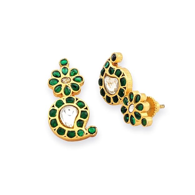 "The Traditional Gold Plated Emerald and Kundan Studded Dangle Earrings with Push Back Closure are more than just accessories; they are a piece of art that reflects the rich heritage and timeless beauty of Indian jewelry. Wearing these earrings not only enhances your appearance but also allows you to carry a piece of tradition and culture with you wherever you go. With their exquisite design and fine craftsmanship, these earrings are a must-have addition to any jewelry collection.